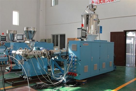 Het ruwe de kaliberbepaling van de schroef extruder→-Moulds→Vacuum van material+additive→Mixer→Auto Feeder→Hopper dryer→Single tank→Spray Koelen tank→Haul-van Unit→Cutting Unit→Stacker